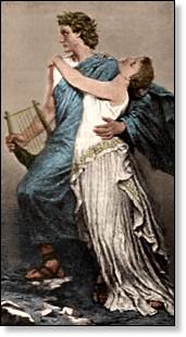 | Eurydice (yoo-RID-i-see). Nymph, wife of Orpheus. Eurydice stepped on a poisonous snake and died while running away from the minor deity Aristaeus. Her husband was so disconsolate that he journeyed to the Underworld and asked permission of its rulers to bring her back. This was granted, on the condition that he not look at Eurydice while leading her toward the land of the living. They were almost to safety when he forgot and looked back. | |