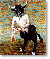 | Minotaur (MIN-uh-tawr). A monster, half-man, half-bull, that devoured sacrificial victims thrown into the Labyrinth. Born of Queen Pasiphae's god-inflicted infatuation with a bull, the Minotaur was eventually killed by Theseus. The monster is generally depicted as having the head of a bull and the body of a man. But in the Middle Ages, artists portrayed a man's head and torso on a bull's body. | |
